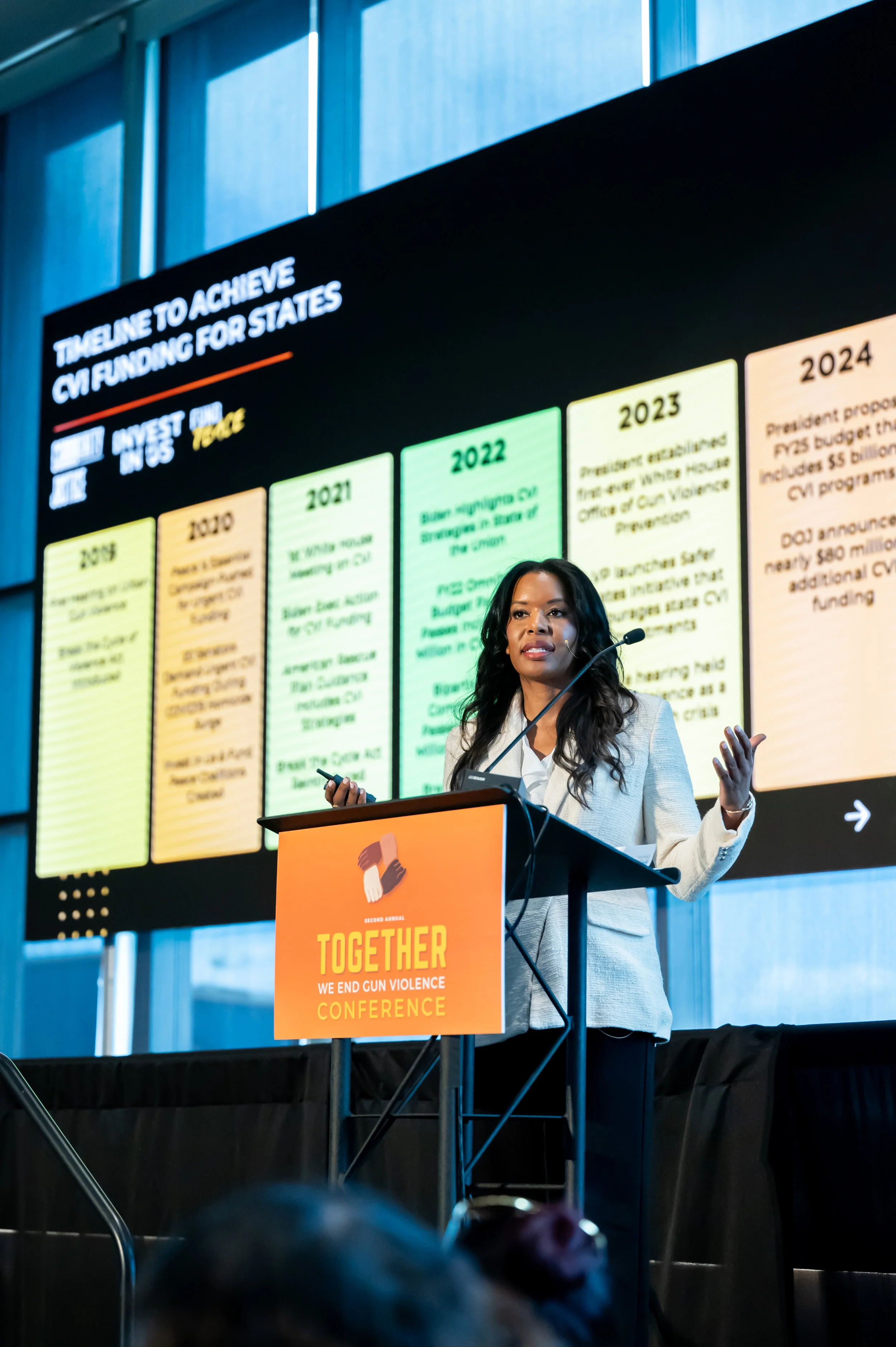 Nationally, Amber founded and led the Community Justice Action Fund, the nation’s only Black- and Brown-led gun violence prevention organization. Under her leadership, the organization helped unlock more than 1.9 billion dollars for community-centered safety strategies and helped shift more than 12 billion dollars in federal funding priorities toward prevention. She testified before Congress during the first-ever House hearing on urban gun violence and later served on the Biden-Harris Transition Team, helping coordinate national partnerships among violence prevention leaders during a pivotal moment for public safety policy.